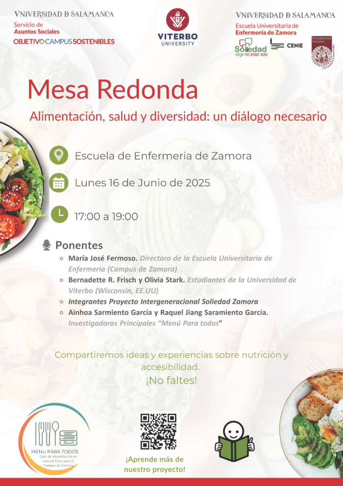 El pasado lunes 16 de junio de 2025, se celebró en la Escuela Universitaria de Enfermería de Zamora una enriquecedora mesa redonda titulada “Alimentación, salud y diversidad: un diálogo necesario”. Este evento reunió a profesionales y estudiantes comprometidos con la mejora de la nutrición y la accesibilidad alimentaria, en el marco del proyecto “Menú Para Todos”, una guía de alimentación en lectura fácil pensada para el Campus de Zamora.