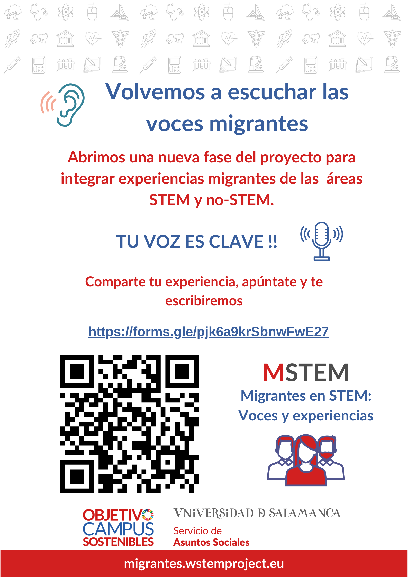 📢 Iniciamos la segunda fase del proyecto Migrantes en STEM: Voces y Experiencias, que amplía su alcance para incorporar otras áreas del conocimiento (No-STEM) y la participación de estudiantes y profesionales migrantes de la Universidad de Salamanca y de otras universidades de Castilla y León, con el objetivo de recoger una visión más amplia y diversa de las experiencias migrantes en el ámbito universitario.