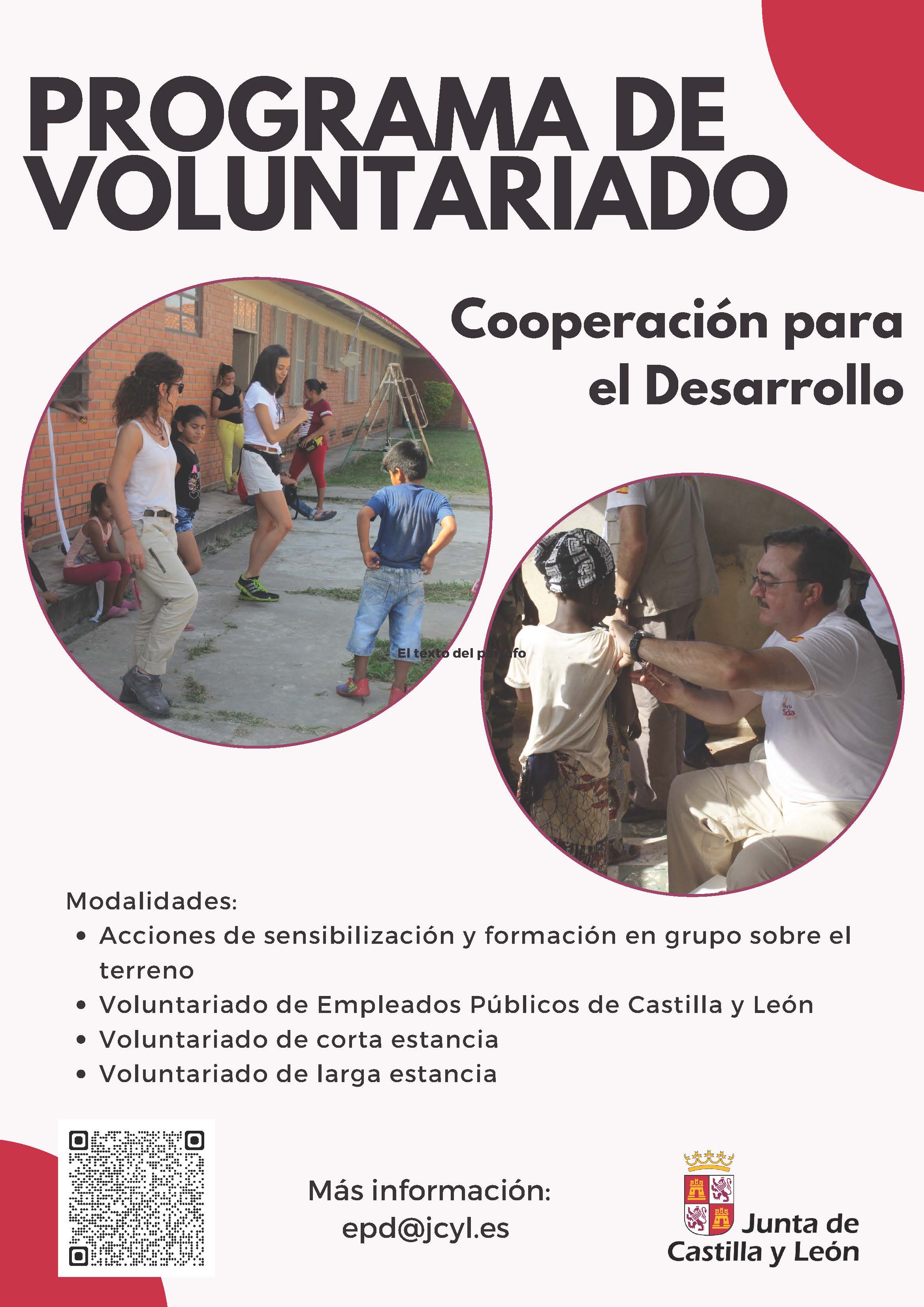 - Modalidad B) -Voluntariado de Empleados Públicos de Castilla y León. Integración en un proyecto de cooperación internacional para el desarrollo, en países empobrecidos; duración entre 3 y 4 semanas.