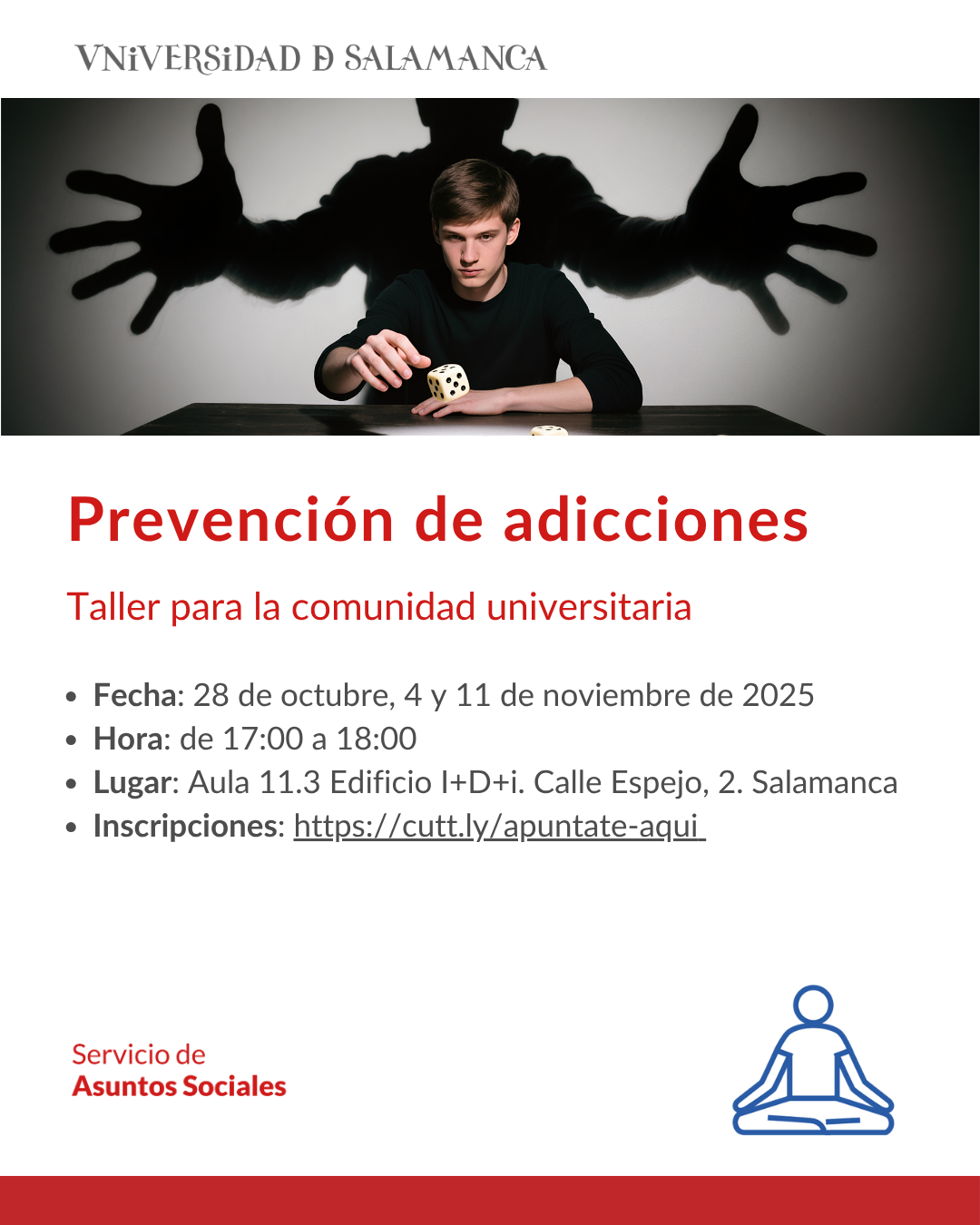 El Servicio de Asuntos Sociales de la Universidad de Salamanca organiza un taller dirigido a toda la comunidad universitaria con el objetivo de ofrecer un espacio de reflexión y aprendizaje sobre la prevención de adicciones.